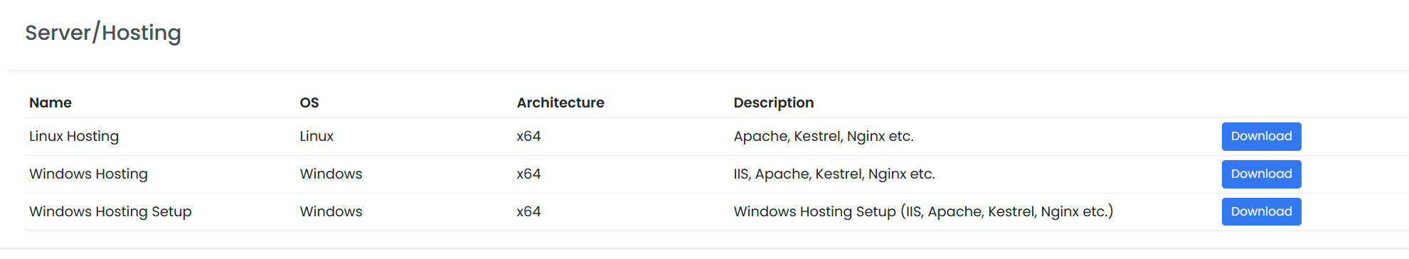 Versions you can use by hosting on IIS, Apache or Nginx. You can download and install the version specific to the operating system you want to use.&#x20;